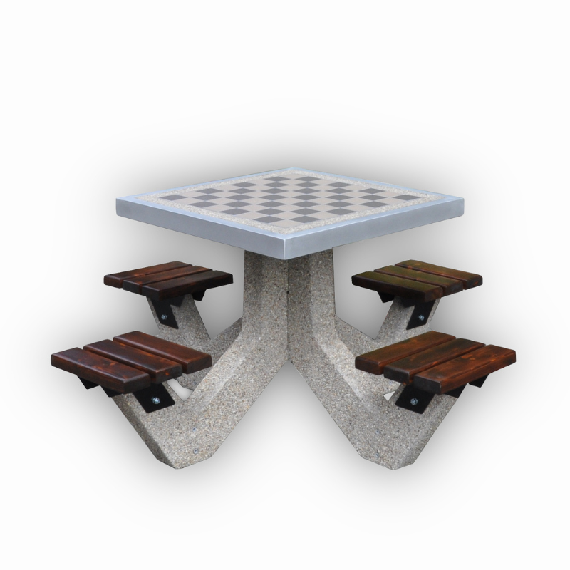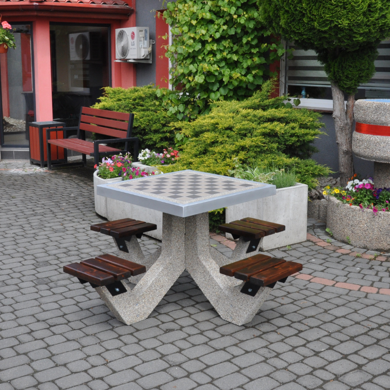 Elementy betonowe stolika wykonane są z betonu wysokiej klasy C30/37, zbrojonego stalą oraz mikrozbrojeniem, wykonany w technologii „beton płukany” pokryty kamieniem płukanym lub mieszanką grysów.