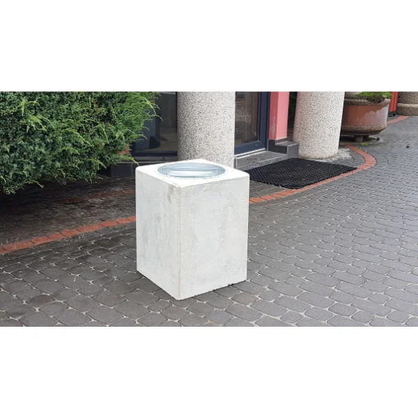 Kosz betonowy wykonany jest z wysokiej klasy betonu architektonicznego w kolorze szarym lub białym, impregnowany powłoką antygraffiti, zbrojony stalą.